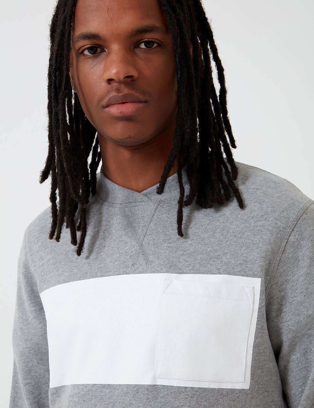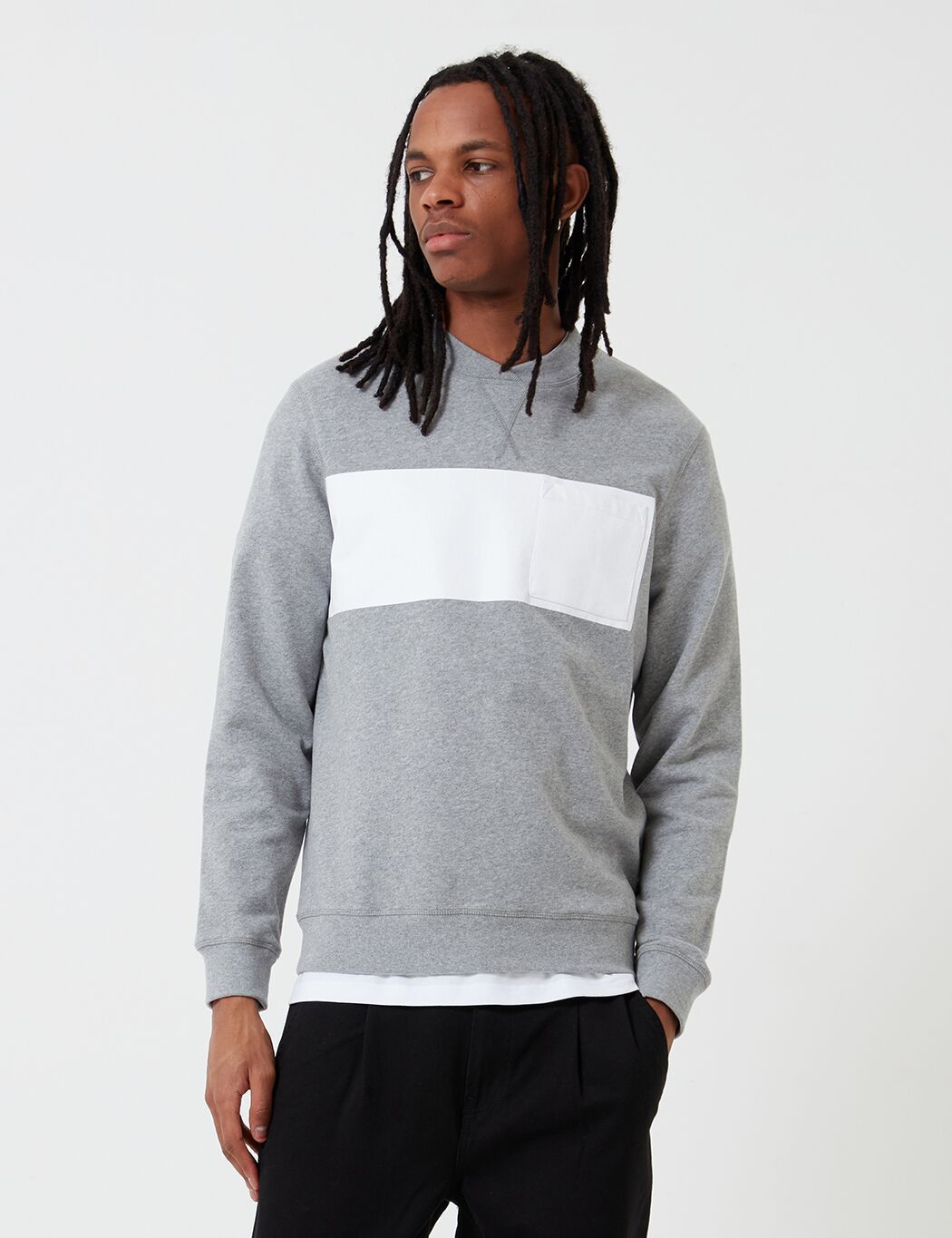 The Herbrides Barbour white label crew neck sweatshirt, made for the Japanese market, features thick ribbed neck detailing, one heavy horizontal stripe and square chest pocket, Barbour branding in neck line.