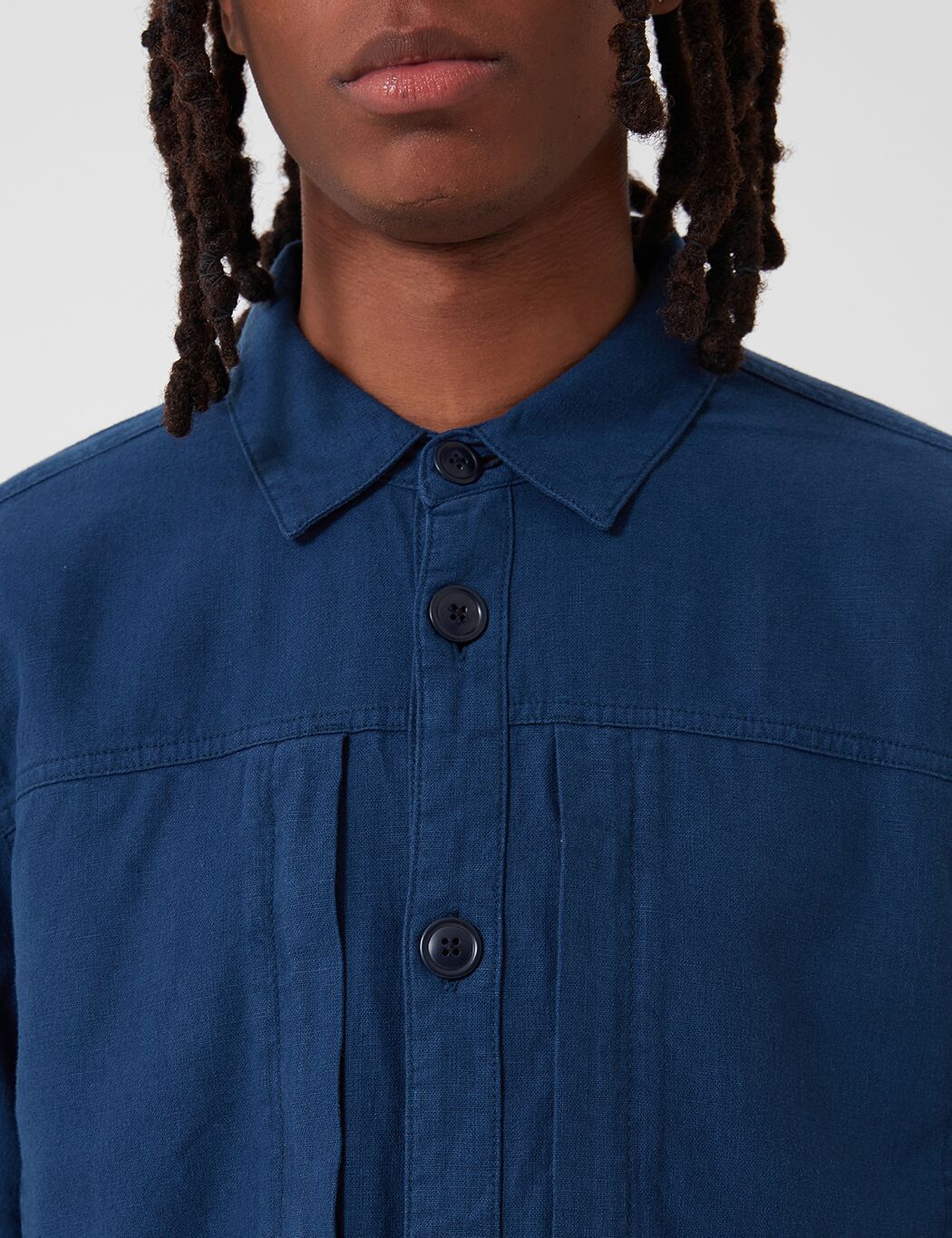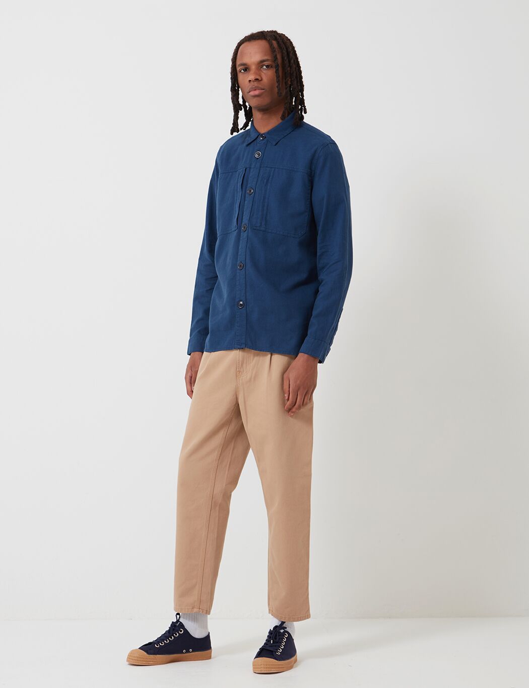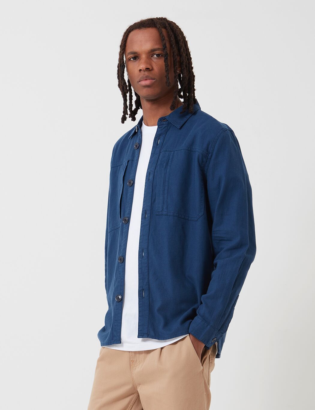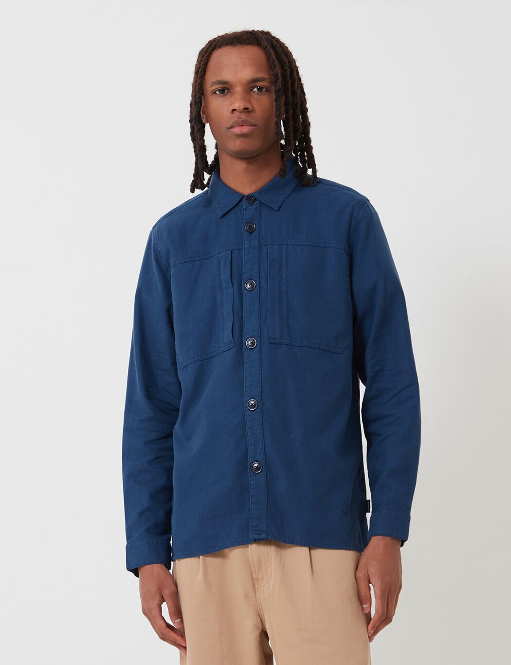 The Kilda linen and cotton mix overshirt featuring heritage workwear pocket detailing on chest with button placket closure, minimal Barbour tab branding on side seam.