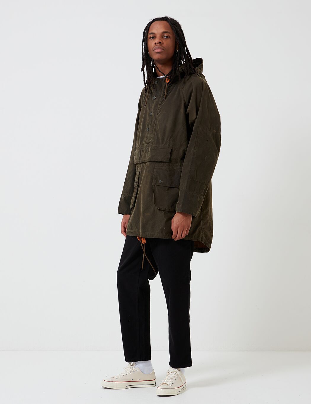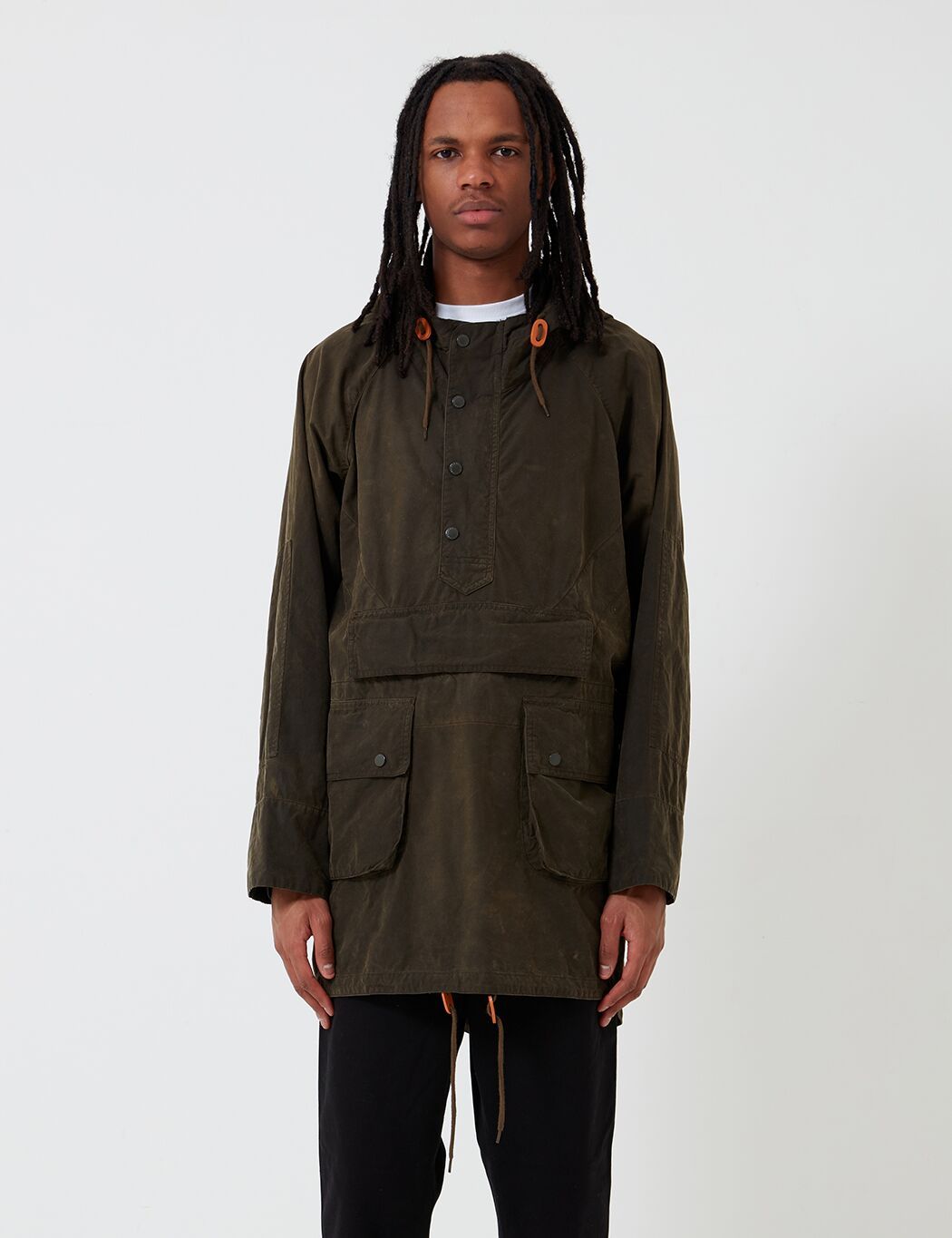 The Engineered Garments x Barbour Warby jacket. Inspired by the Longshoreman smock, the Warby is reimagined this season in a washed 6oz waxed cotton for a uniquely aged finish. Cut to a shorter, more contemporary fit than the original.