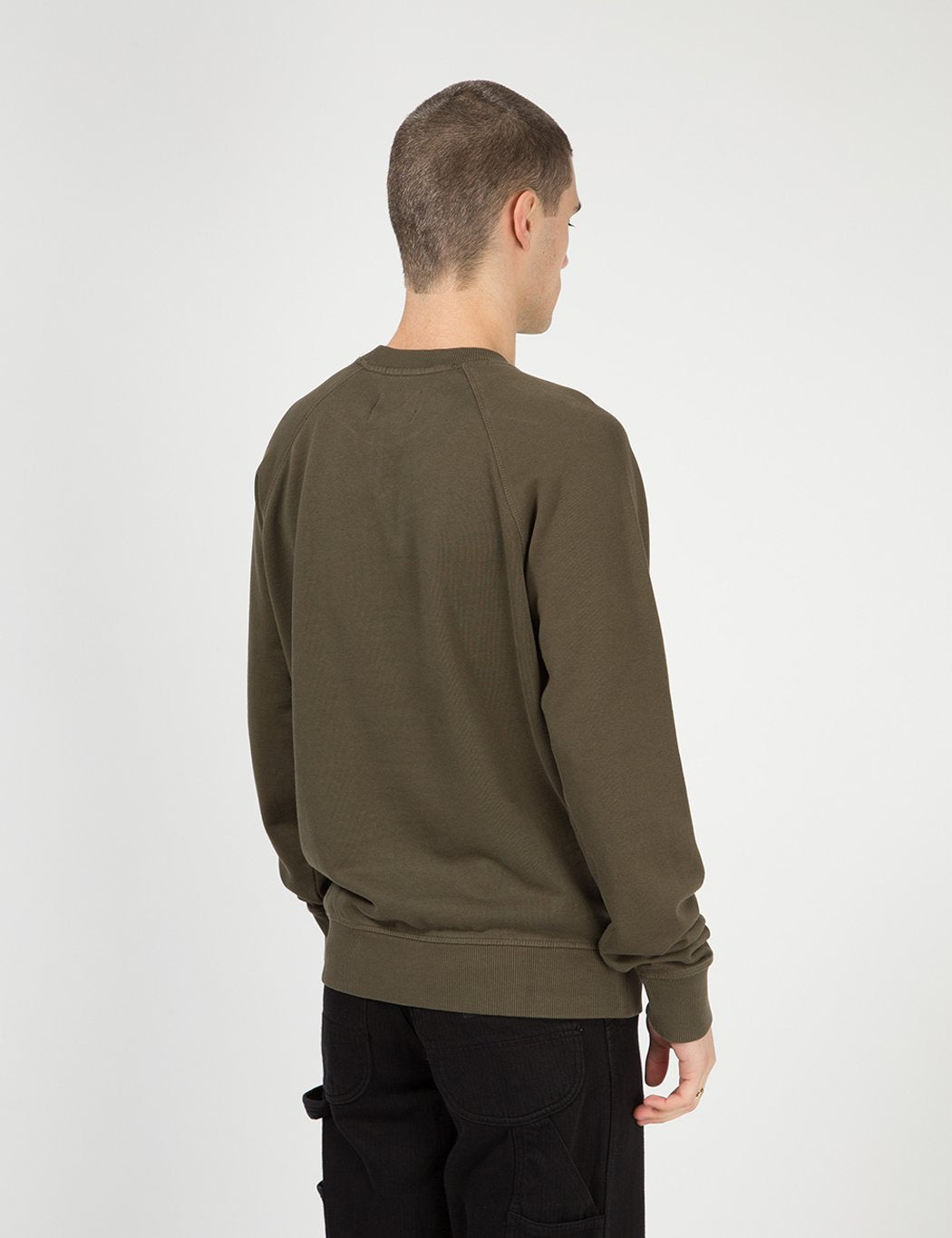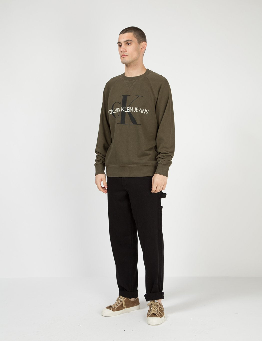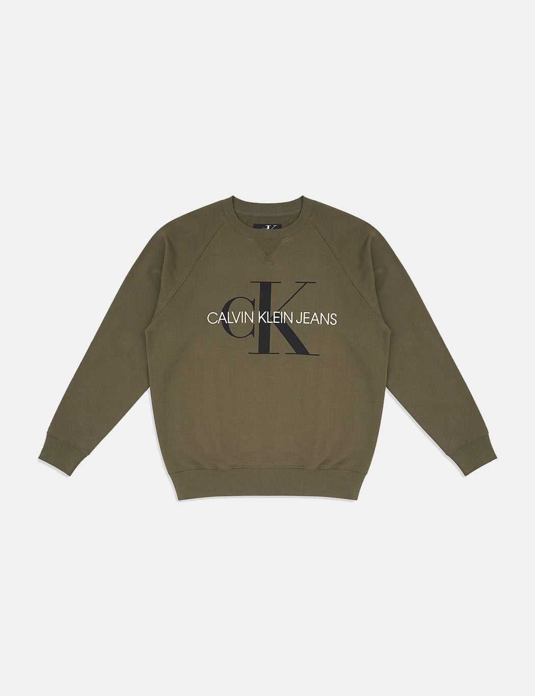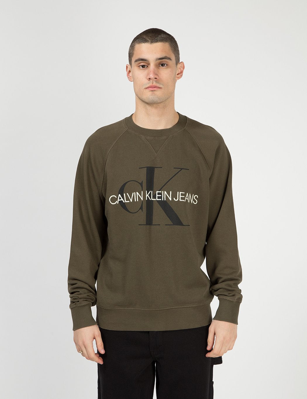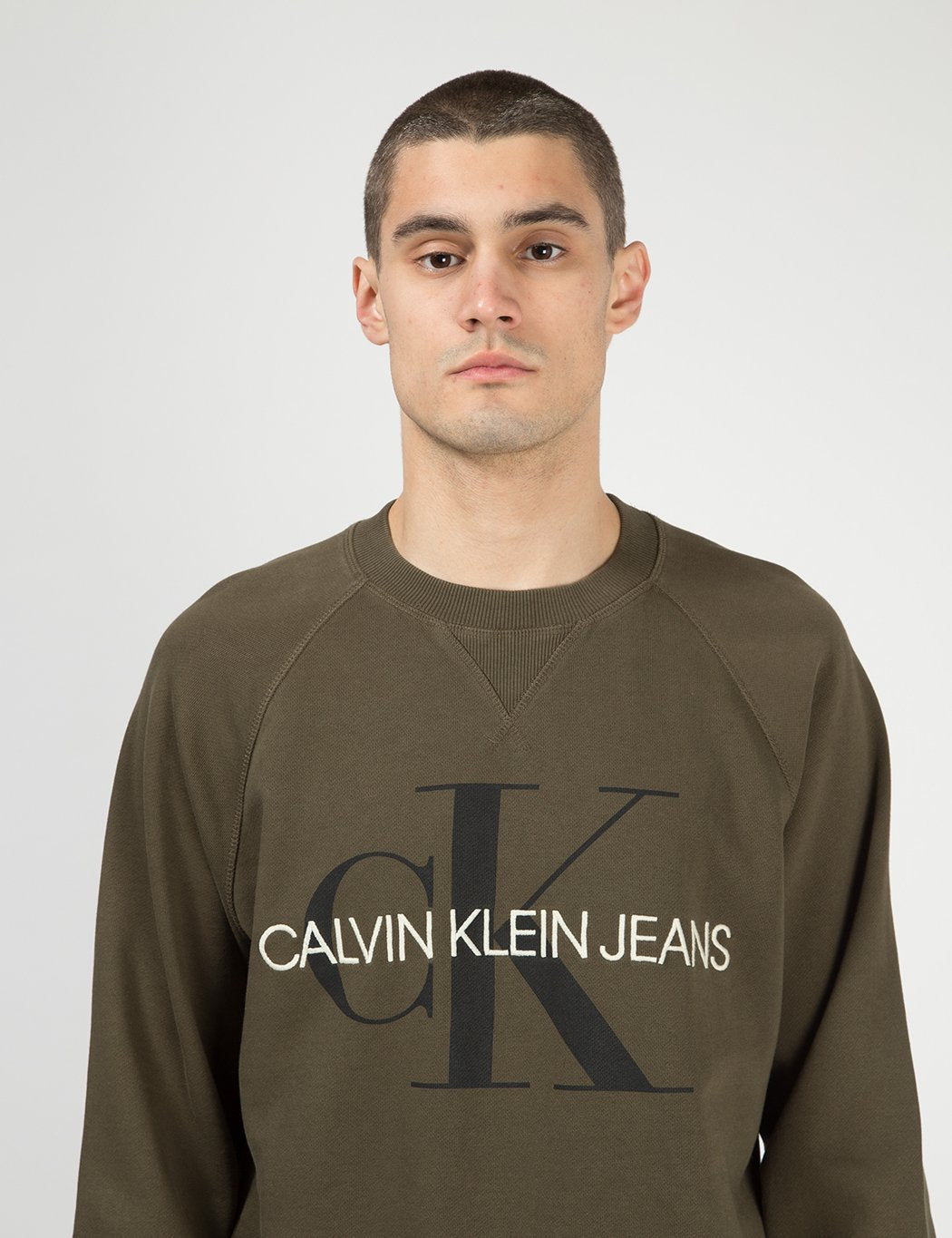 The Calvin Klein Calvin washed monogram logo crew neck sweatshirt in grape leaf (olive green) from the Calvin Klein Jeans Autumn/Winter 2019 collection.