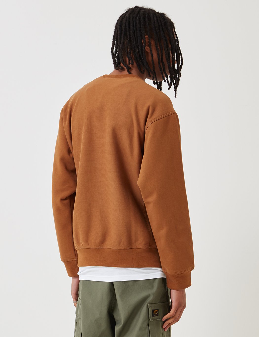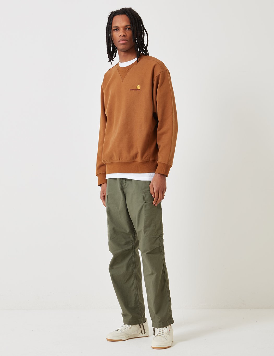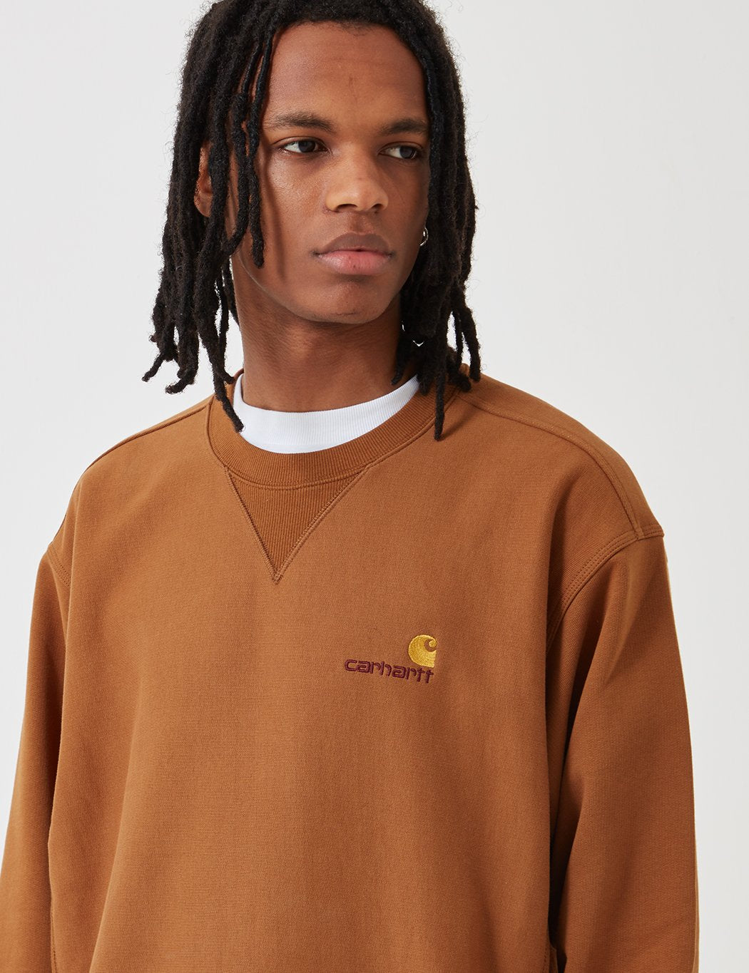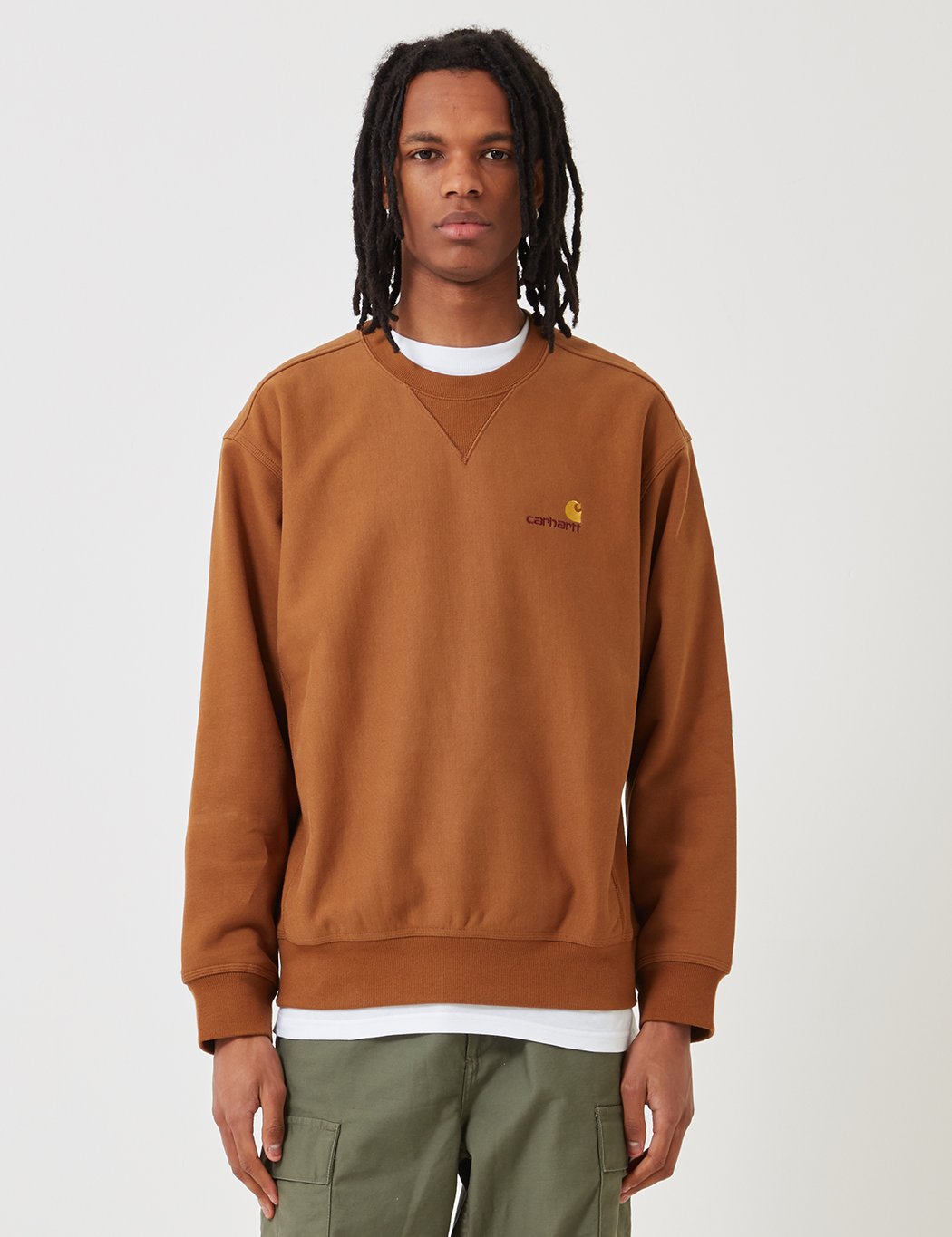 The Carhartt WIP American Script Sweatshirt from their SS19 Sweater Collection has a relaxed boxy shape. Made from a 12.3oz heavyweight cotton-poly jersey which has been garment washed in a timeless Hamilton Brown.
