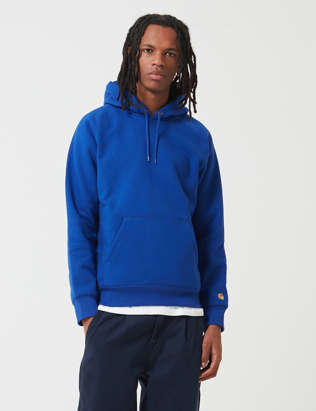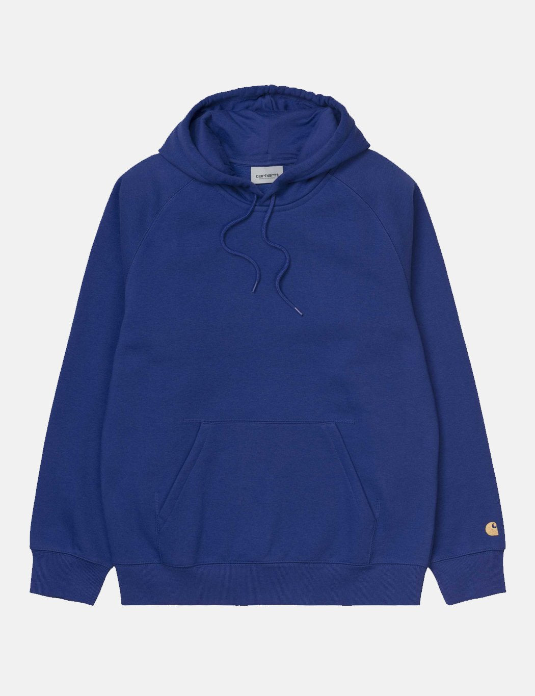 The Carhartt Work In Progress Chase Hooded Sweatshirt in Thunder Blue with Gold embroidery from the Carhartt Chase sweatshirt range.