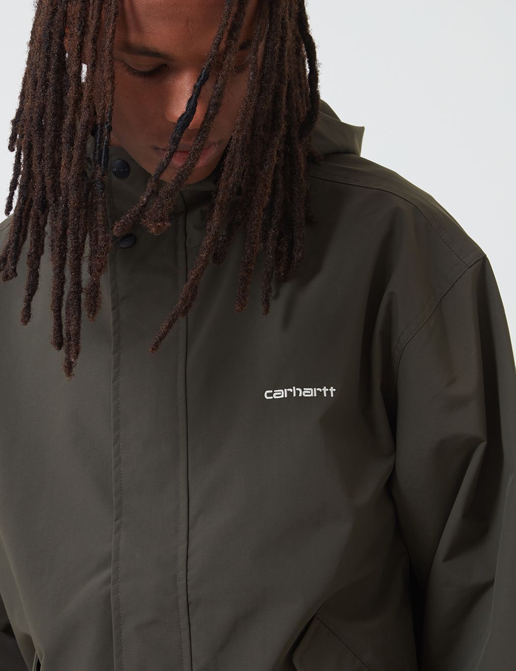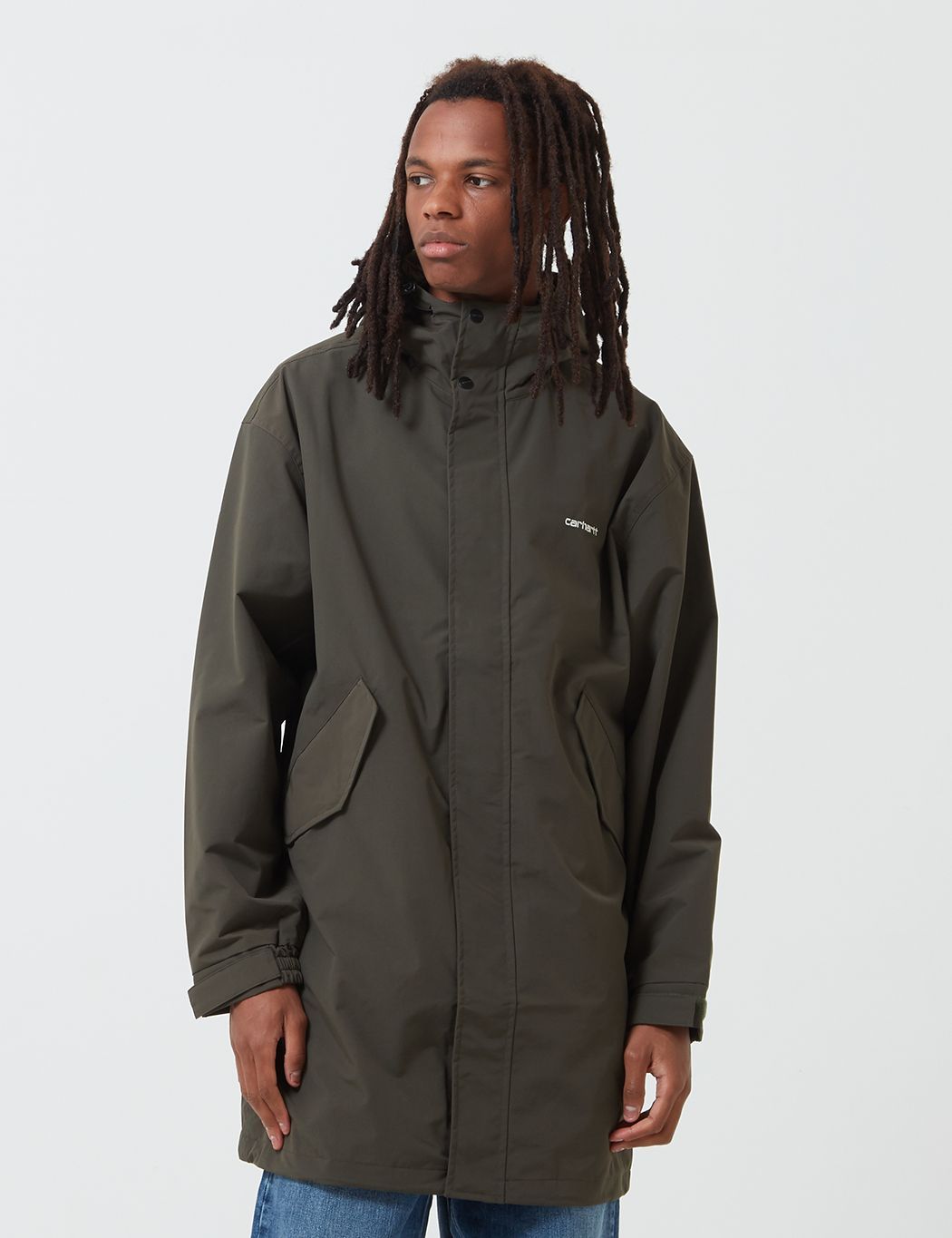 Loose fit Carhartt Parka jacket with front closure featuring hidden two-way zip and snap buttons, mesh lined, adjustable hood, cuffs, waist and bottom band.