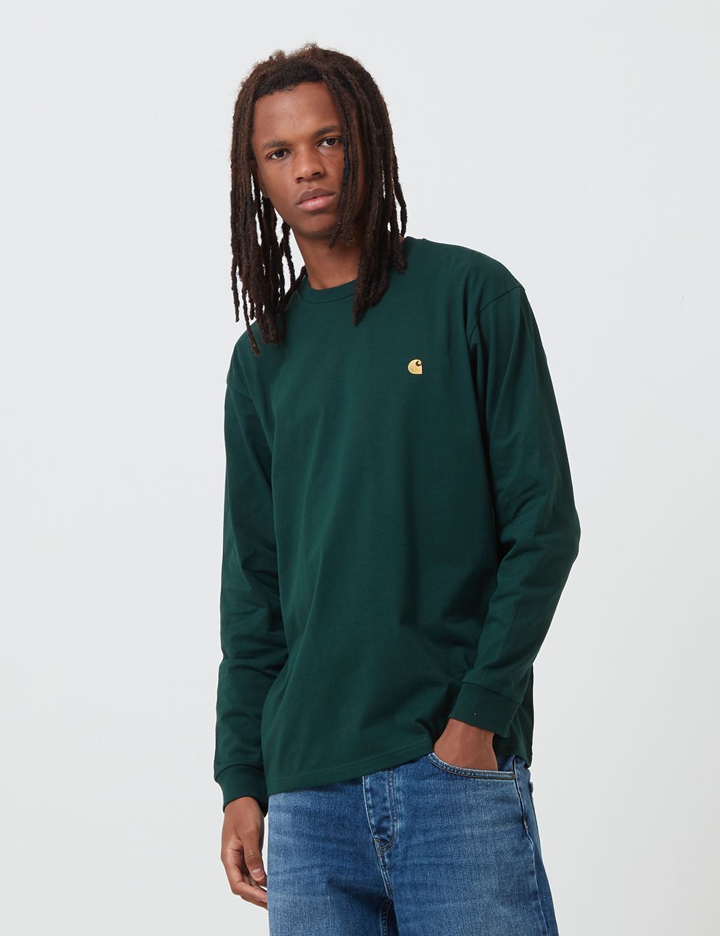 The Carhartt Work In Progress Chase long sleeve t-shirt in bottle green with gold embroidery from the Carhartt Chase collection.