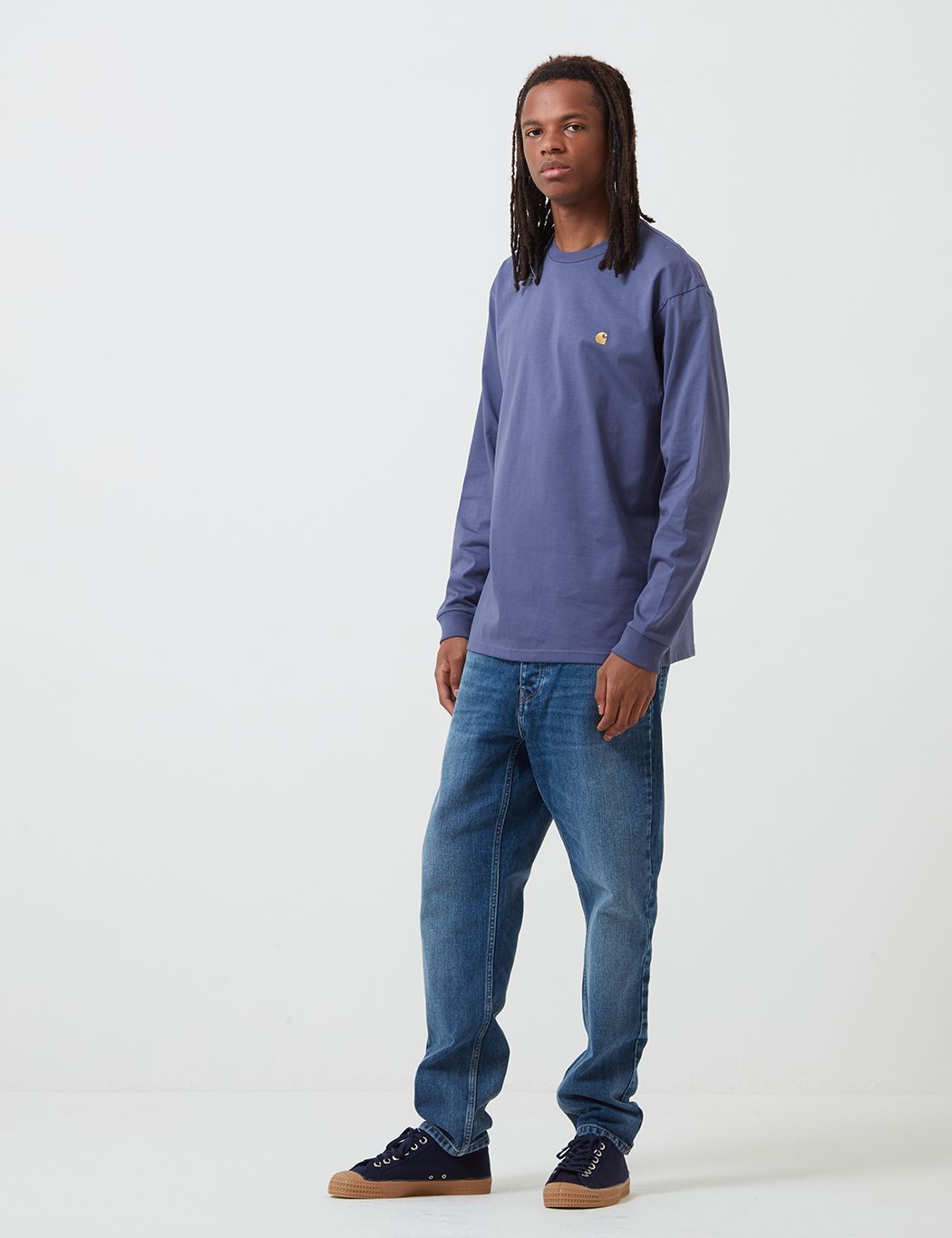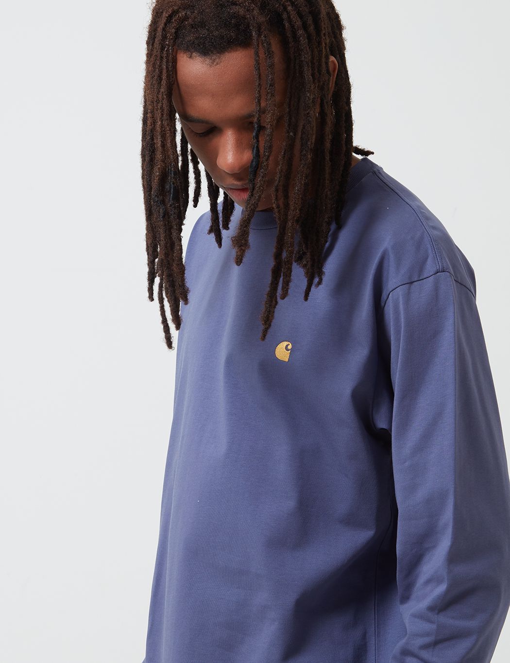 The Carhartt Work In Progress Chase long sleeve t-shirt in cold viola with gold embroidery from the Carhartt Chase collection.